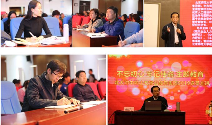 2019年10月25日,北京师范大学马克思主义学院教授、中央司局级干部自主选学主讲教师杨世文教授来到北大附中石景山学校,为集团校广大党员教师做题为《不忘初心牢记使命,努力推动高质量发展》的主题报告。杨世文教授在报告中指出,党的十八大以来,以习近平总书记为核心的党中央紧紧围绕“新时代坚持和发展什么样的中国特色社会主义、怎样坚持和发展中国特点社会主义”这个基本问题,创造性地提出了习近平新时代中国特色社会主义思想,开启了中国经济发展的“第三次革命”历程。