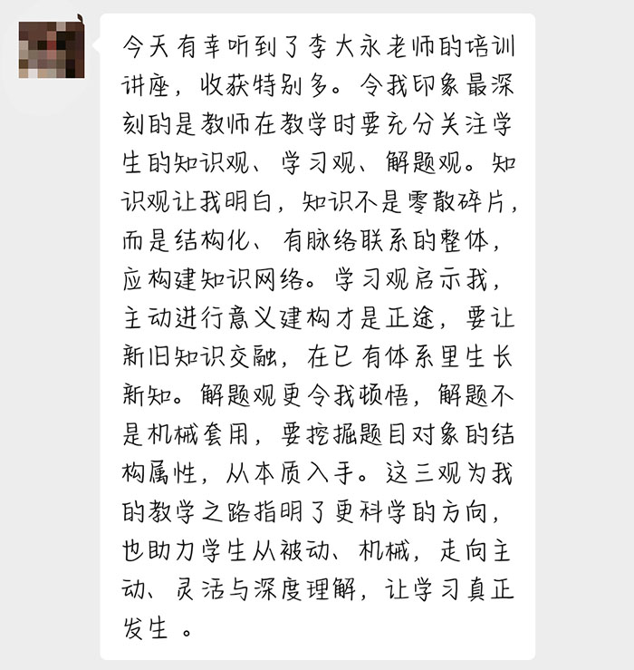 李老师的讲座引发全体教师的强烈共鸣与深度反思。教师们深刻认识到,培优教学需扎根于学生的知识观、学习观与解题观,促进知识结构化、学习自主化与解题本质化。大家从理论方法与鲜活案例中,掌握了引导学生精准审题、贯通知识脉络、构建系统策略的要领,完成了从“机械训练”到“意义建构”的教学跃升,显著增强了教学实效性与思维培育深度。