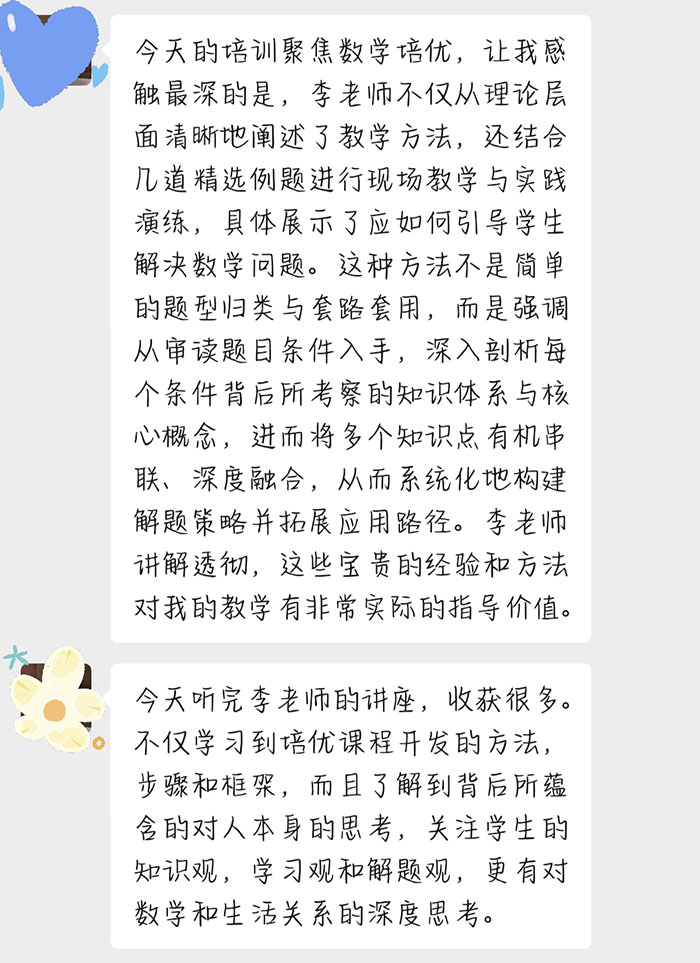 以此次培训为起点,教研组将持续深化教学实践,着力完善“主题教研+课例开发+学力评估”三位一体的教研机制。未来,我们将依托专家引领与团队协作,进一步优化培优课程内容与教学方法,探索更契合学生发展需求的数学培优路径,助力学生数学素养进阶与思维能力飞跃。
