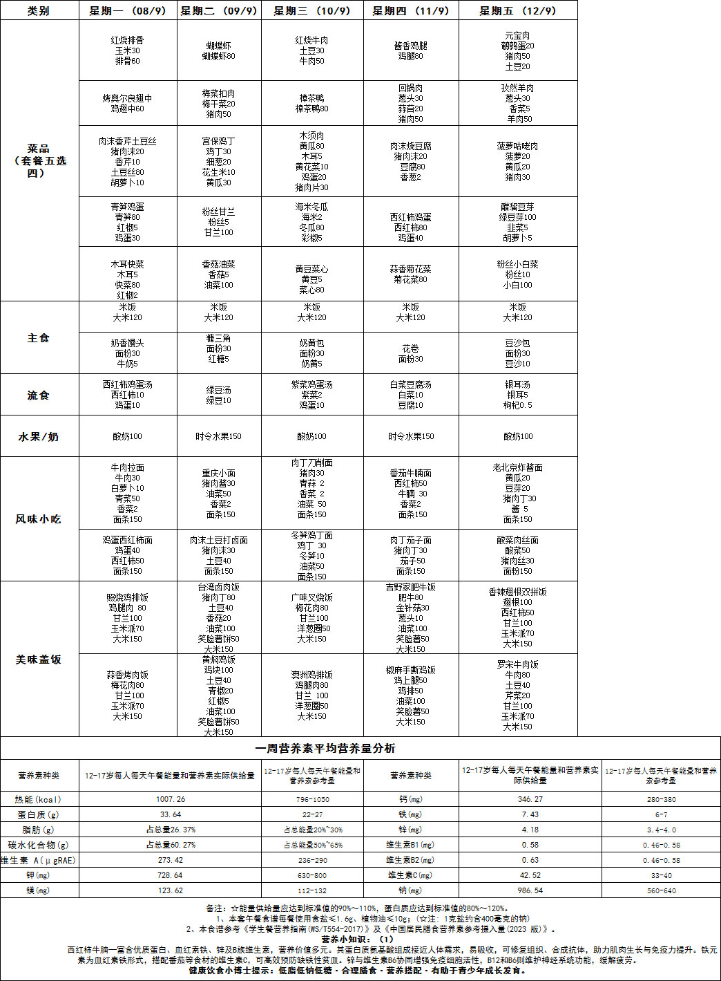 北大附中石景山学校西黄村校区中学午餐食谱(2025.9.8-2025.9.12)