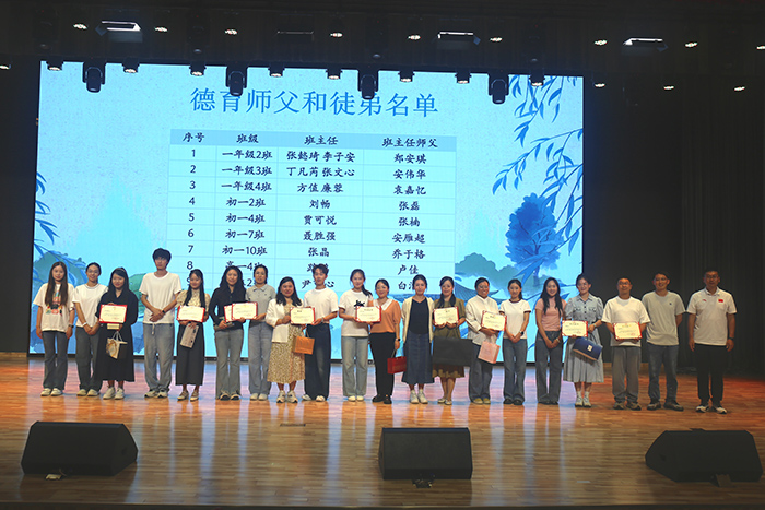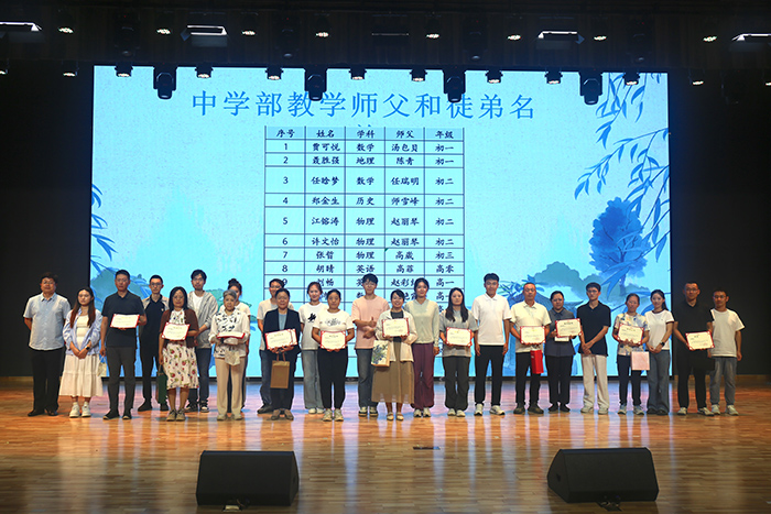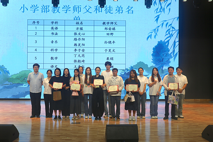 随后,德育、小学教学、中学教学领域的师徒依次结对,徒弟向师父行鞠躬礼、赠心意礼,任欢迎副校长和徐文博副校长分别为师父颁发聘书,师徒合影定格温馨瞬间,标志着北大附中石景山学校教育精神的新一批传承开启。