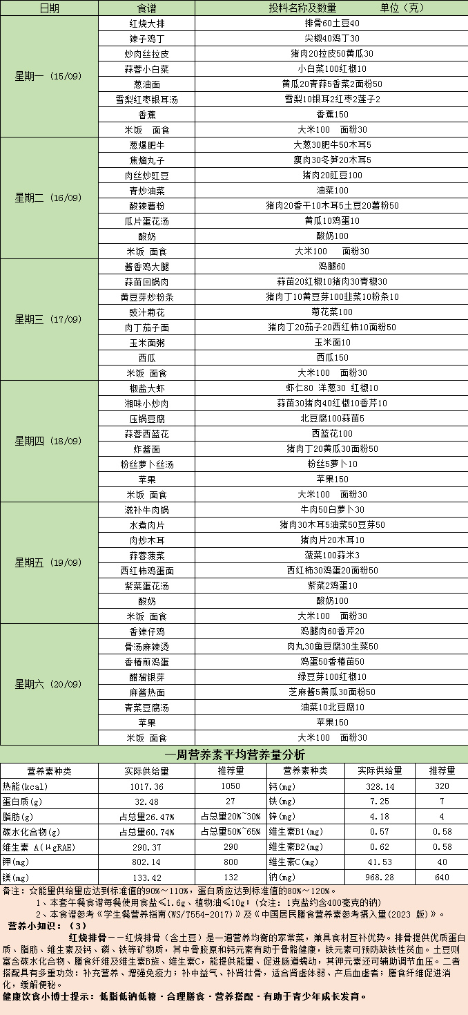 北京大学附属中学石景山学校八大处校区菜谱2025年9月15日-2025年9月19日