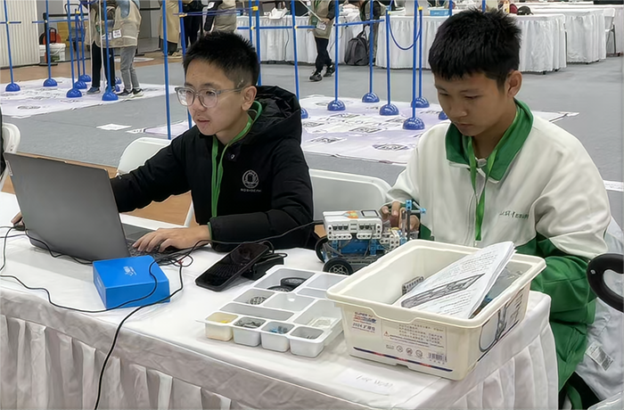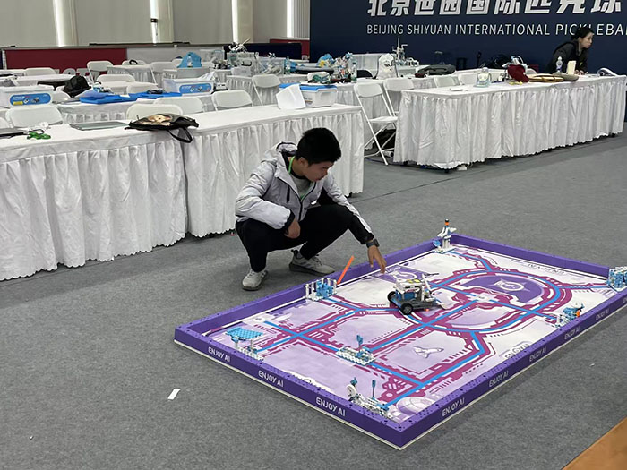 比赛现场气氛紧张而热烈。面对陌生的比赛环境和强劲的对手,我校学生迅速进入状态,全神贯注地投入到机器人的最后检查与调试中。在任务挑战环节,他们分工明确、配合默契,根据现场情况灵活调整策略,精准操控机器人完成各项指令。每一次成功的任务执行,都凝聚着他们平日刻苦训练的汗水与智慧。
