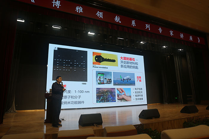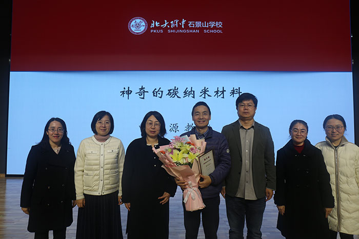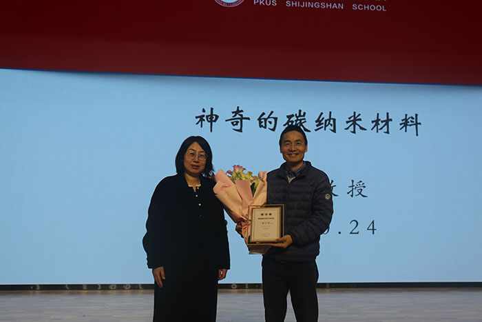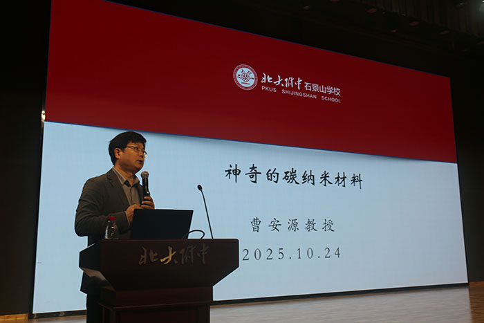 10月24日,北大附石高中部的同学们一起聆听了由北京大学材料科学与工程学院教授、先进碳材料研究所所长曹安源教授带来的以“神奇的碳纳米材料”为主题的博雅领航系列专家讲座。这是一场科学与人文交织的盛宴,讲座现场氛围热烈,掌声不断,同学们凝神细听,获益匪浅。讲座伊始,由徐文博副校长致辞。由此我们了解到曹教授是一位深耕碳纳米材料领域的学者,曾斩获国家杰出青年科学基金、北京大学蔡元培美育奖教金等诸多荣誉,研究成果卓著。