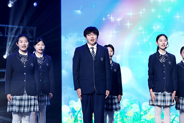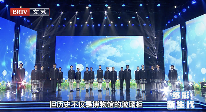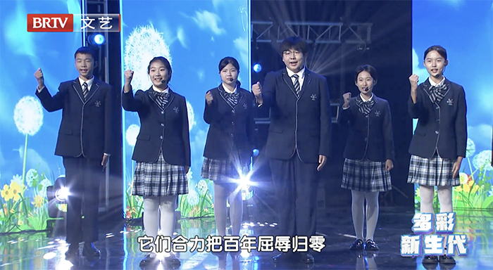 从教室排练到北京广播电视台的聚光灯下,学生们用声音与肢体诠释了何为“少年的担当”。当灯光亮起,历史篇中左手握拳、右手挥下的动作,将“百年屈辱归零”的爆发力定格为震撼的画面;少年篇里张开双臂模拟“试管冒泡”的瞬间,让科学探索的激情跃然眼前;未来篇一字一顿的“闪!闪!发!光!”配合渐强的旋律,引发现场掌声如潮。