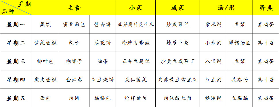 北大附中石景山学校西黄村校区中学早餐2025年11月3日-2025年11月7日