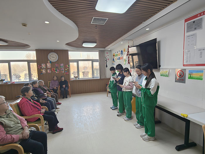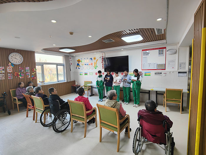 当天下午,5名学生志愿者在王晓鹏老师的带领下,为老人们提供暖心服务。同学们精心筹备了节目,逐一登场为老人表演。养老院现场气氛热烈、笑语不断,同学们用自己的才艺向老人们致以真挚祝福,为他们的生活播撒更多明媚与生机。