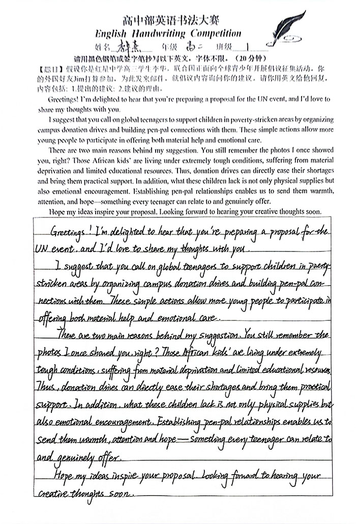 比赛筹备阶段,高零、高一、高二年级英语组教师形成联动合力,通过课堂专题动员、课后一对一指导、优秀作品范例展示等多种形式,向学生系统讲解英文书写的规范要点、审美价值及提升技巧。各班同学积极响应,利用课余时间勤加练习,从单个字母的占格比例、单词间的合理间距,到句子的排版逻辑、整篇作品的视觉协调,逐一打磨细节,展现出浓厚的参与热情与严谨的学习态度。