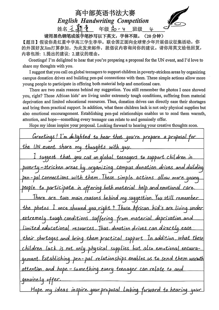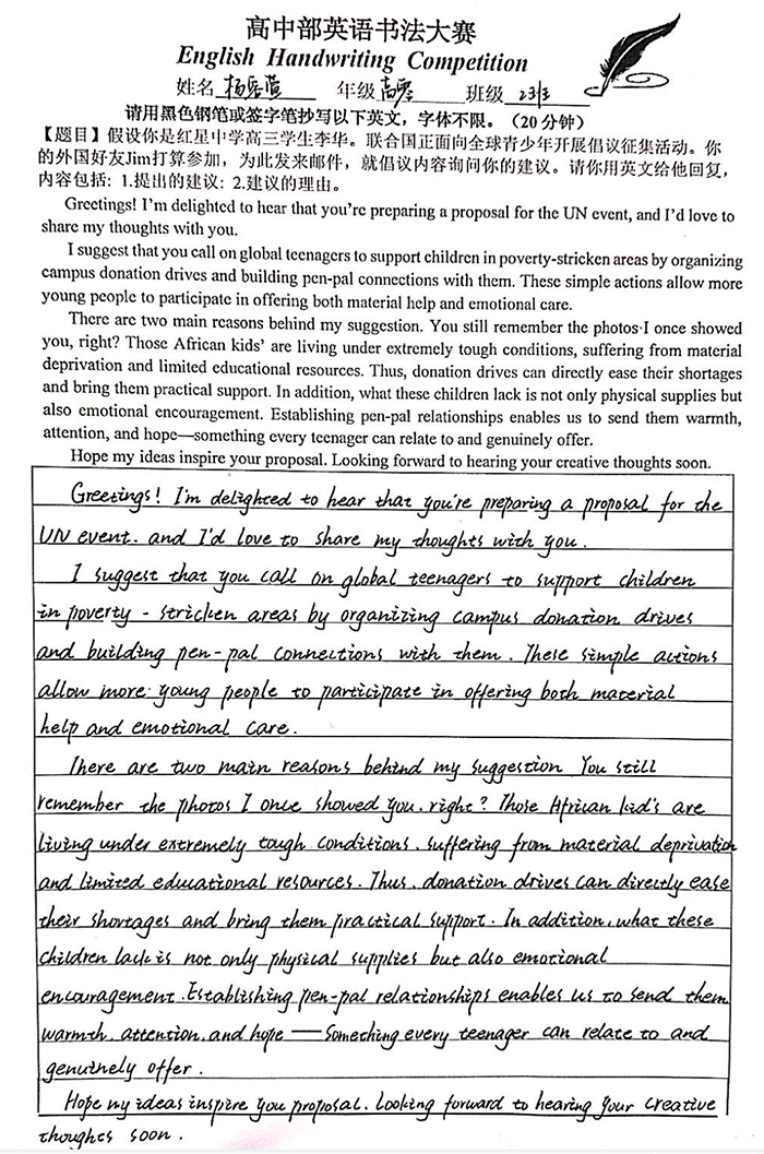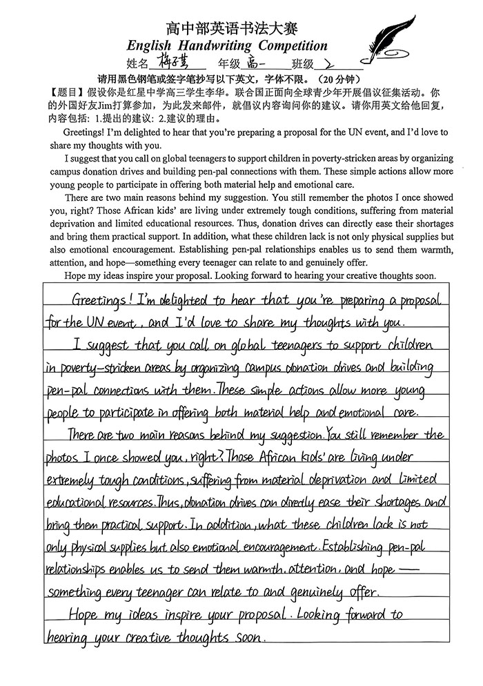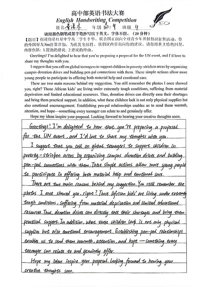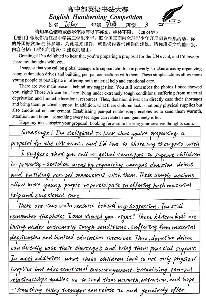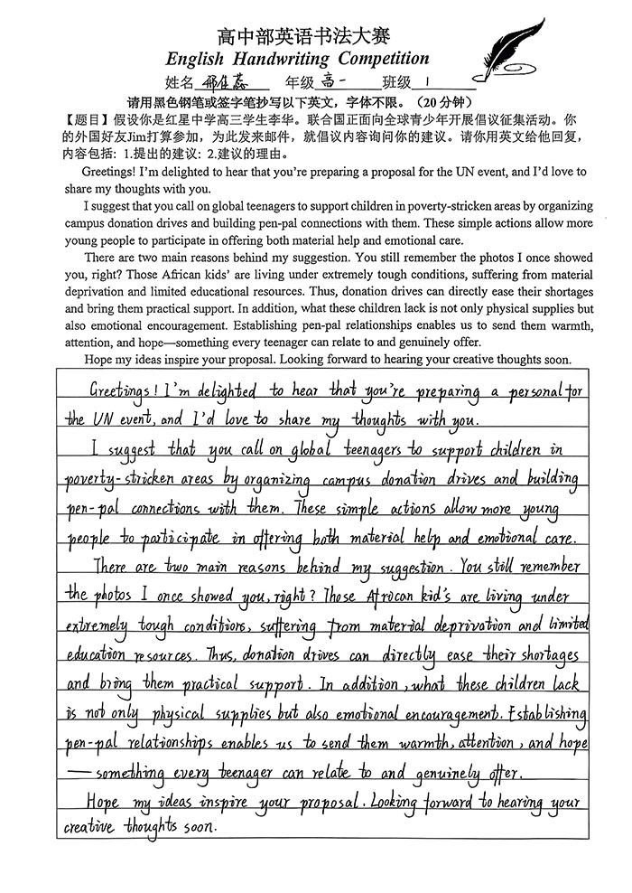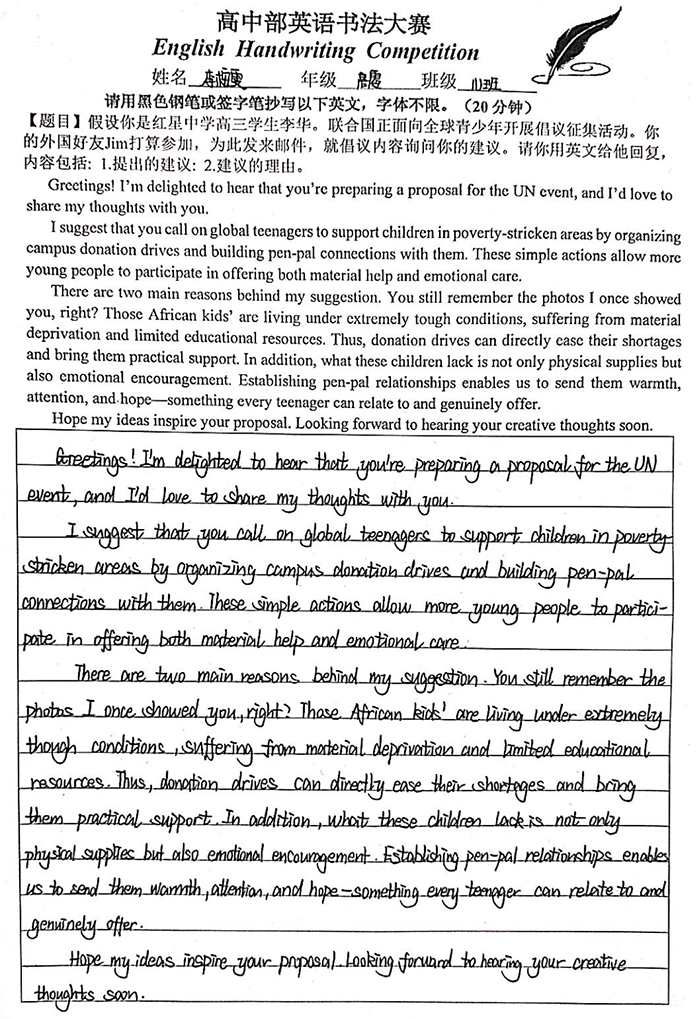 为扎实提升学生英语核心素养,强化英文书写规范意识,进一步激发英语学习热情,营造墨香浸润的校园文化氛围,近日,我校高中部英语教研组精心策划并成功举办英语书法比赛。本次赛事以“规范英文书写”为核心目标,引导学生在笔墨挥洒间感受英文文字的韵律之美,体悟语言表达的独特魅力。