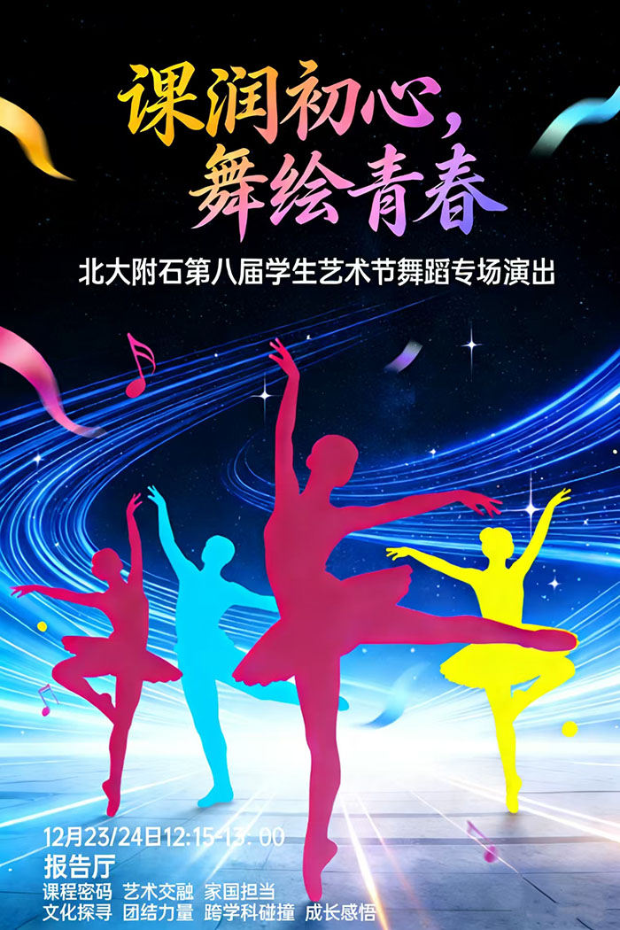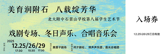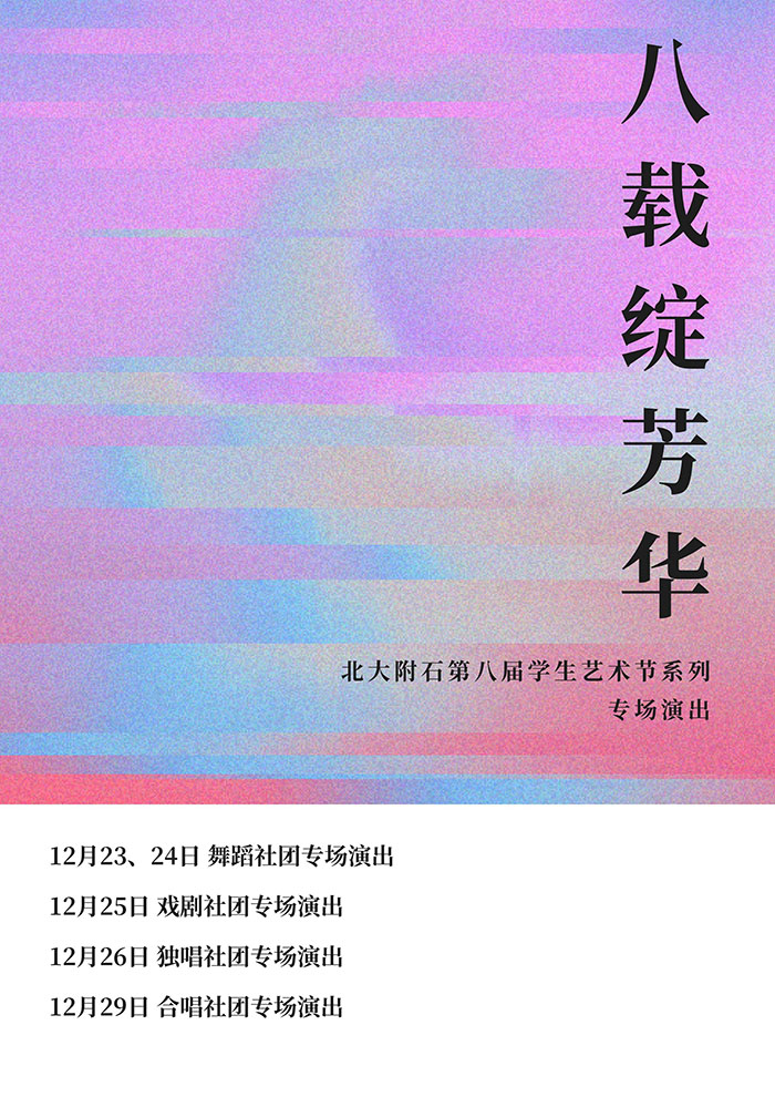 八载芳华,美育浸润。在这辞旧迎新的冬日,北京大学附属中学石景山学校第八届学生艺术节即将璀璨启幕。一系列由学生精心筹备、精彩纷呈的专场演出将轮番上演,展现附石学子的艺术才华与青春风采。诚邀全校师生共赴这场年度艺术盛宴!