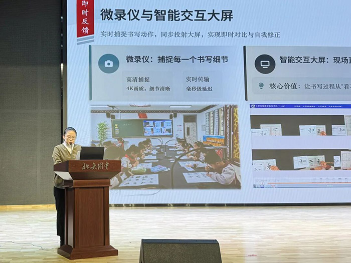 北大附小石景山学校借助AI重塑书法教学评价体系。AI智能助教对学生作品的章法、结构、线条进行精准分析并提供改进建议;微录仪实时捕捉书写过程,方便学生直观对比;AI虚拟人技术打造“古今对话”场景,深化学生对书法文化的理解。学校还构建多元评价共同体,通过电子成长档案和3D虚拟展厅,推动书法教育从“技法训练”转向“素养培育”。