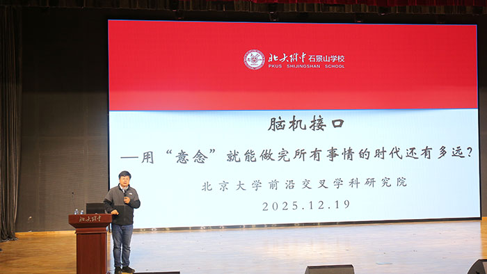 2025年12月19日,北大附中石景山学校特邀北京大学前沿交叉学科研究院的脑机接口领域专家,走进校园带来主题为“脑机接口——用‘意念’就能做完所有事情的时代还有多远?”的科普讲座。本次讲座聚焦脑机接口前沿技术,从科学原理的底层逻辑、研究领域的最新进展,到未来发展的伦理思辨,为高一高二年级的师生们呈现了一场兼具科学深度与趣味互动的科技盛宴,也让师生们近距离触摸到脑科学与工程技术交叉融合的前沿魅力。