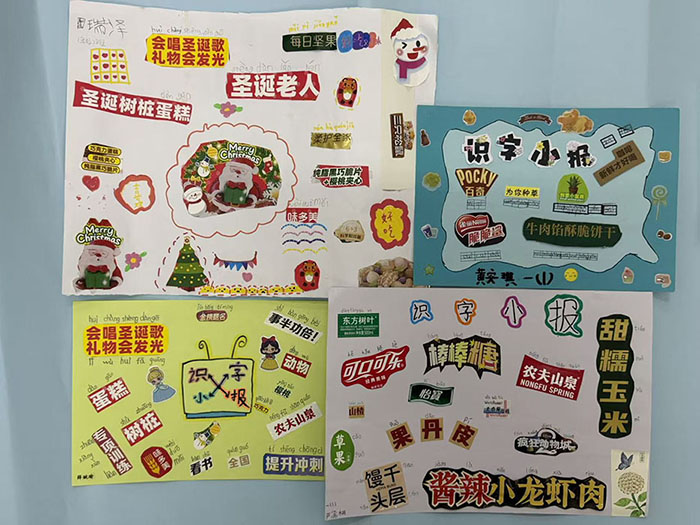 在生活中孩子们也主动识字认字,他们从各个地方亲手剪下了自己会认的字。一张张五颜六色的小报,就是孩子们探索汉字王国的最好纪念。