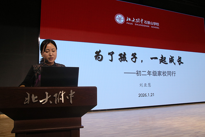 2026年1月21日下午,北大附中石景山学校初二年级期末家长会在报告厅如期召开。本次家长会由初中部刘亚慧副校长主持,以“为了孩子,一起成长”为主题,围绕学校育人实践与家长协同路径展开,明确家校协作方向,筑牢共育根基。