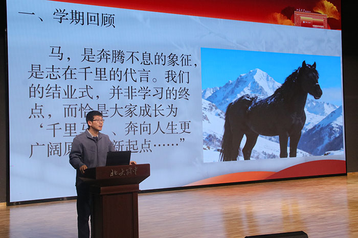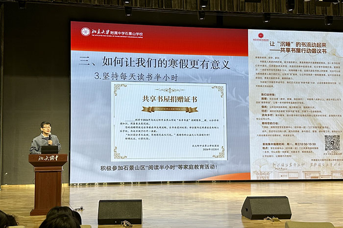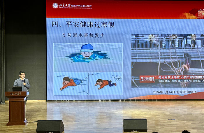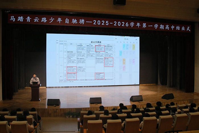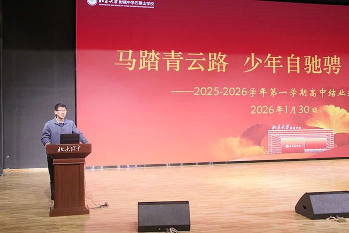 2026年1月30日,北大附中石景山学校举行2025-2026学年第一学期高中结业式,高中学段全体师生共同参与。学校特别邀请本校2023届优秀毕业生、现就读于北京工业大学大三的孟云天同学返校作《如何玩转高中》专题分享,为学弟学妹们带来关于学业规划、时间管理与创新思维培养的宝贵经验。