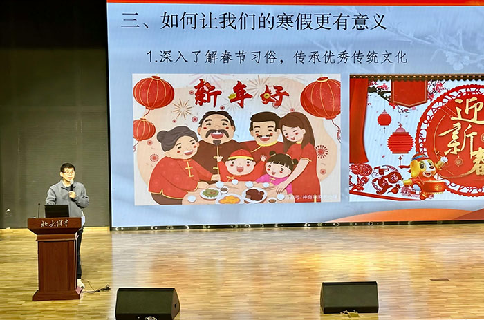 结业式上,副校长任欢迎通过视频带领师生回顾了本学期高中部的丰硕成果。本学期,北大附中石景山学子在奥林匹克学科竞赛、科技创新大赛、墨香书法大赛、石景山区艺术节及体育比赛中表现优异。针对即将到来的寒假,学校提出了科学规划建议:合理使用手机等电子设备,设置自动开关机时间保证作息规律;坚持每天运动与阅读,避免网络沉迷;积极参与家庭劳动与社会实践,涵养家国情怀。倡导同学们利用社会大课堂资源打开寒假“京彩”生活,为新学期的学习积蓄能量。