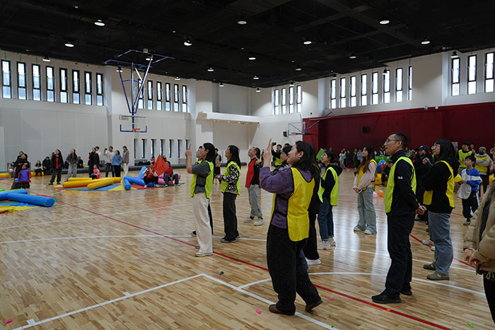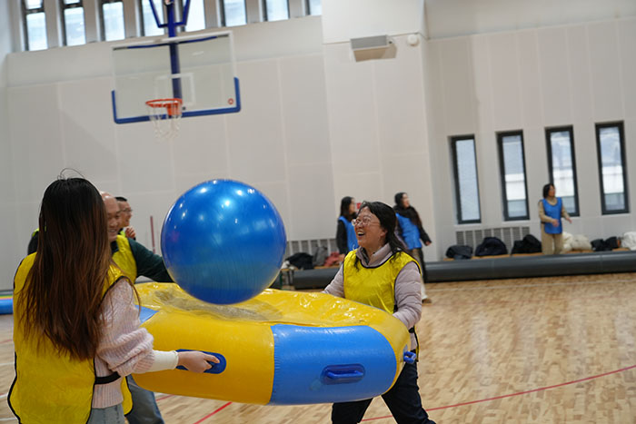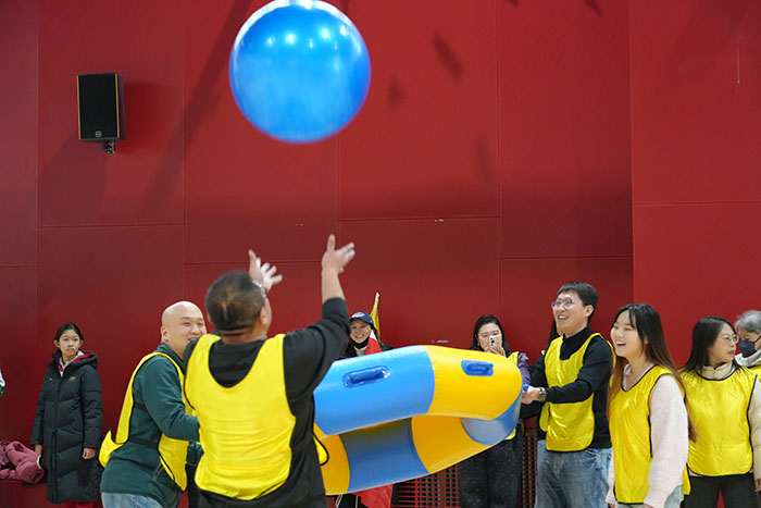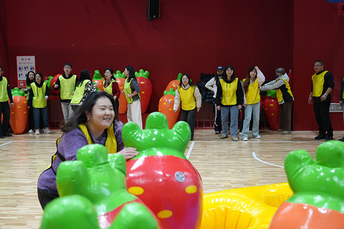 随后,主游戏正式开始。本次活动以4个方阵为单位,每个方阵包含3支队伍,12-13名教师并肩作战,共同挑战四大趣味项目。“移花接木”注重节奏与衔接,大家手递道具、稳步推进,展现出高效的团队协作;“快乐大锤”充满欢乐与惊喜,既有精准敲击的畅快,也有偶尔“误伤”队友的诙谐瞬间,引来阵阵欢笑;“出类拔萃”与“雷霆战鼓”则将竞技氛围推向高潮,老师们齐心协力、奋勇争先,体育馆内加油声、欢呼声此起彼伏。