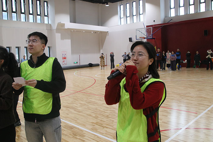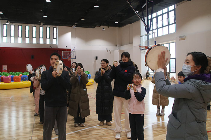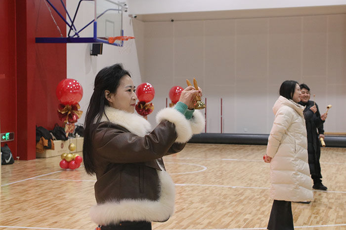 活动伊始,小学部教师郑安琪与中学部教师王旭东组成的主持搭档活力登场,简洁明快的问候瞬间点燃现场氛围。随后,一场别开生面的集体打击乐《喜洋洋》拉开活动序幕——每位老师手持专属乐器,跟随欢快旋律自由敲击,清脆的节奏交织成最动听的新年祝福,将心中的喜悦与热情尽情释放。