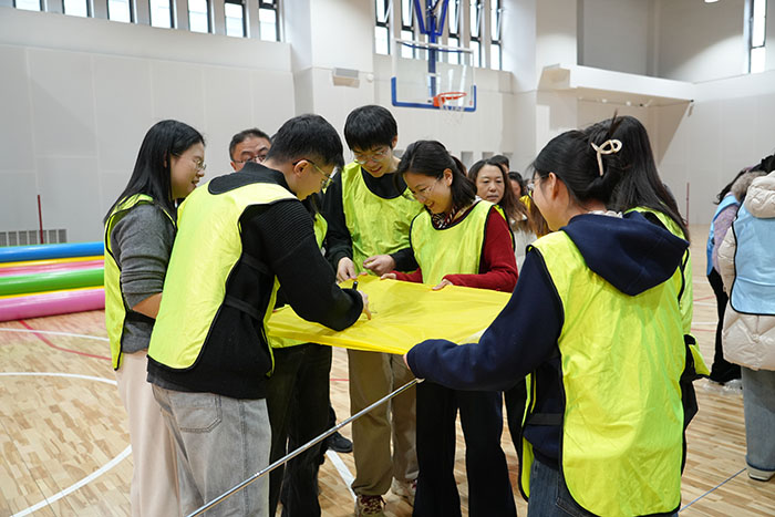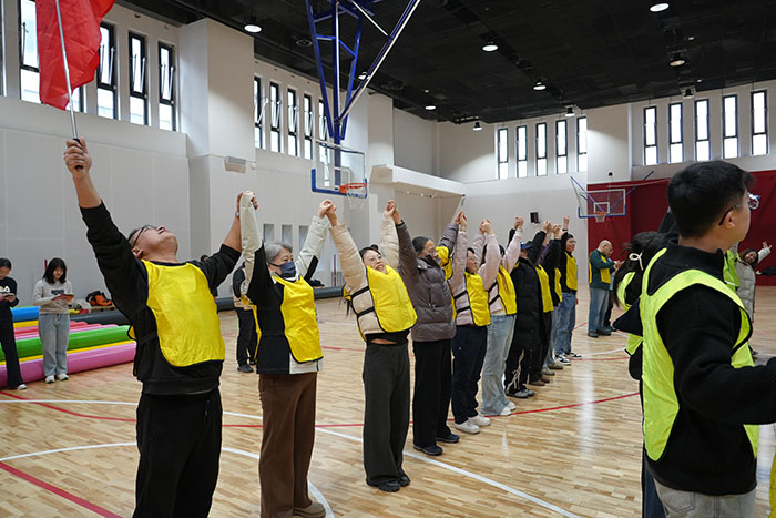 开幕式后,主教练带领全体教职工分组开展融冰互动与热身游戏。