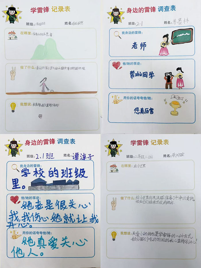 对于一年级的“小萌芽”们,学雷锋是从身边最小的事做起。在老师的带领下,孩子们化身为“暖心小助手”,主动帮老师搬运作业本,弯腰捡起走廊上的纸屑,或者帮同桌整理散落的文具。回到家中,他们与爸爸妈妈围坐在一起,亲子共读雷锋故事绘本。在温馨的亲子时光里,雷锋叔叔的形象在孩子们心中变得鲜活起来。通过“在校实践+在家共读”的双重体验,让奉献与善良的种子,在孩子们幼小的心灵中悄悄萌芽。
