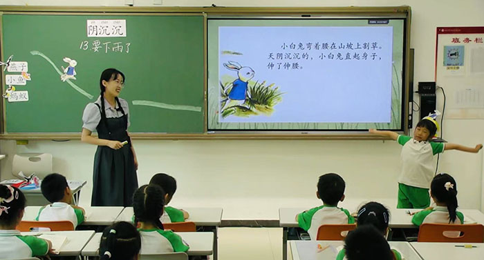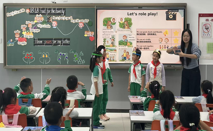 苟雅婷老师以“情境创设促进语言生成,浸润体验提升核心素养”为主题,开展了一年级英语故事教学实践。教学中,她采用多种形式呈现内容,并融入AI教学手段,以支持学生在情境中的语言学习过程,旨在提升其对主题意义的理解与表达能力。本次课程设计以新课标为依据,结合进班试讲的实际反馈,对教学设计进行了二十余次调整与优化。备赛过程中,区教研员孙波老师和学科组老师们对教学设计提出了修改建议通过多次迭代,最终形成了一节结构清晰、活动有趣、内容适切的故事教学课。