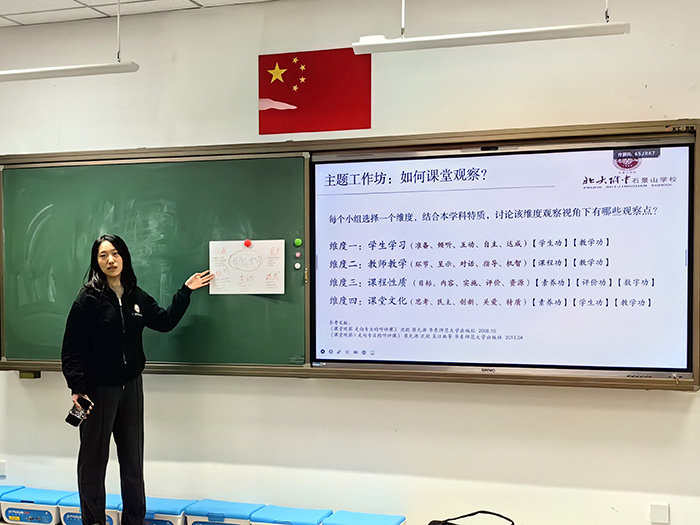 为逻辑线索,启发大家深入思考。在分组研讨环节,教师们以学科组为单位,结合本学科教学特点,展开热烈讨论,各组成员各抒己见、相互启发,最终形成了兼具学科特色观察方案,并推选代表进行分享交流,氛围热烈。