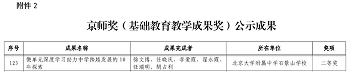 在北京市教育教学成果评选中,我校申报的教育教学成果“从薄弱到优质:微单元深度学习助力中学跨越发展的10年探索”荣获北京市教育教学成果奖二等奖,这一荣誉是对学校深耕课堂教学、深化教育教学改革的充分肯定,凝聚着全体教师在教育教学实践与研究中的智慧与心血。