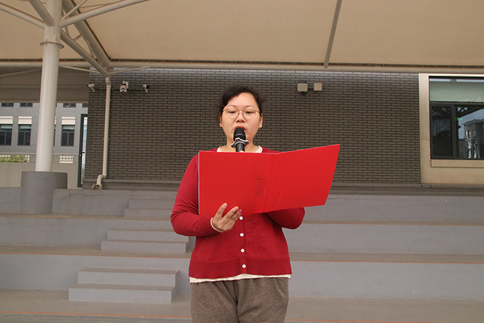 随后,初三(2)班班主任张博洋老师做了“铭记历史星火,照亮强国征程”主题讲话。张老师以2025年九三阅兵为切入点,对比1931年“九一八”事变后,马占山江桥抗战、东北抗联林海游击的抗争岁月,与如今45个受阅方(梯)队如钢铁洪流,气吞万里,“东风-5C”导弹等尖端装备彰显国威,展现出中华民族从危难中奋起,走向伟大复兴的壮阔征程。张老师动情讲述杨靖宇将军以草根、棉絮充饥仍坚守的英雄事迹,提及阅兵中80面抗战英模战旗,强调14年抗战的精神价值。她鼓励同学们通过参观革命纪念馆感悟历史,在早读诵经典、课堂攻难题、体育炼意志中积蓄力量,从值日尽责、关爱同学等小事践行使命担当,以青春之我筑强国之基,让抗战精神照亮未来征程。