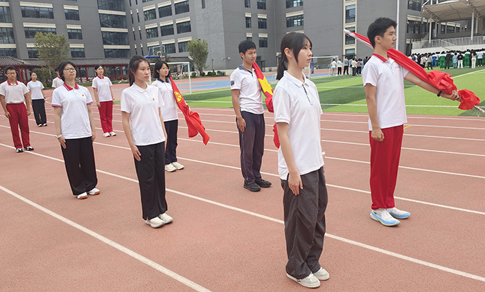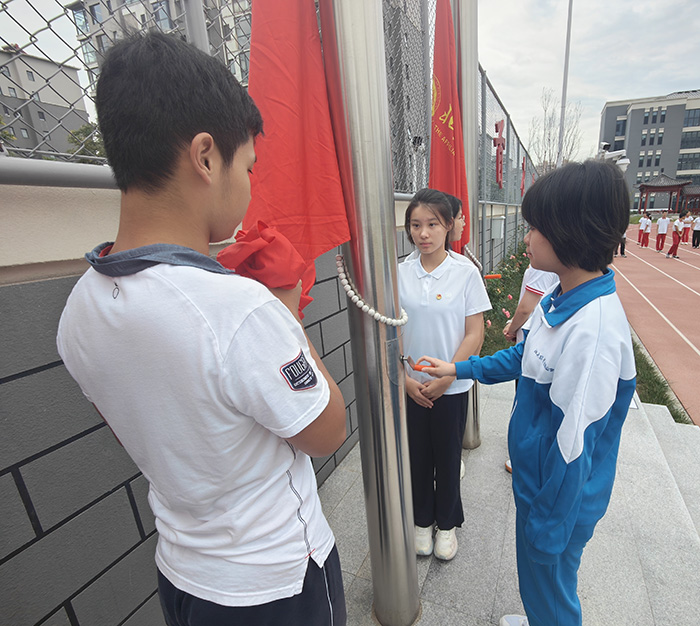 本周的升旗仪式由初三(3)班承担。闫美琪同学担任升旗手。伴随着庄严的国歌,五星红旗冉冉升起。全体师生庄严肃立,向国旗行注目礼,表达对祖国的深切热爱与崇高敬意。这一刻,爱国的情感在每个人心中激荡。