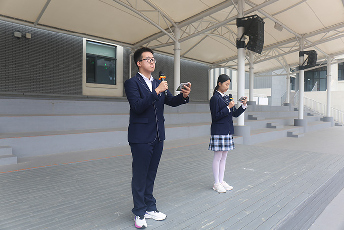 随后,刘露丹、卢锦荣、李一诺、王均睿四位同学以《前沿科技与未来生活》为题进行国旗下演讲。九月是全国科普月,今年的主题是“提升全民科学素养,夯实科技强国基础”。四位同学用饱满的热情和铿锵的语调,从校园生活切入,生动讲述了刷脸入校、编程课堂、3D打印等科技应用,并分享了"墨子号"量子卫星、"奋斗者"号深潜器等重大科技成果背后的青年力量。他们呼吁同学们要保持好奇、勇于实践,在日常生活和学习中培养科学精神,其精彩的演讲赢得了全场师生的热烈掌声。