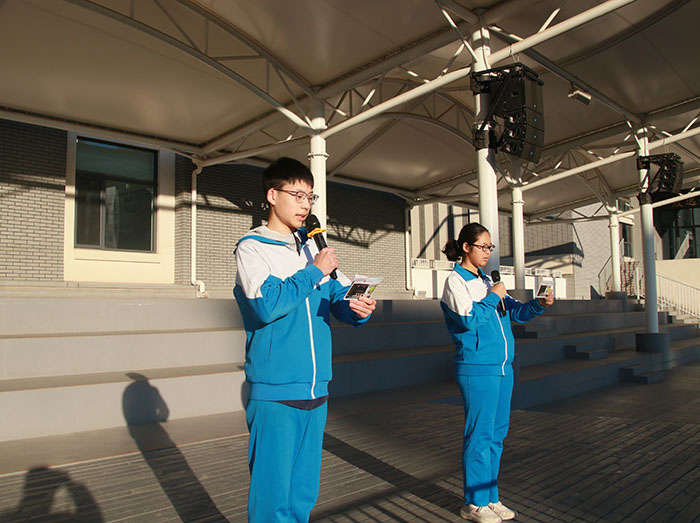 项唯轩同学担任升旗手,之后本班的四位同学带来主题演讲《承重阳文脉,传敬老美德》。演讲中,同学们追溯重阳节的文化根脉——从远古丰收祭天的“敬长”之意,到古代奉送菊花酒、重阳糕的“反哺”习俗,再到儒家“孝悌”思想中李密《陈情表》“先尽孝后尽忠”的抉择,将“敬老”从抽象道德化为融入血脉的文化基因。立足当代,同学们以动人的事迹,诠释“奉养敬亲”的现实意义;同时分享了学校的敬老实践:今年1月退休教师走访慰问活动、5月初一年级志愿者走进颐和泰康养老护理院的“情暖夕阳”活动,让“老吾老以及人之老”的理念落地生根。