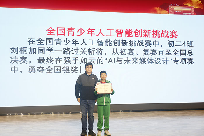 最后进行颁奖环节,在全国青少年人工智能创新挑战赛中,初二4班刘桐加同学一路过关斩将,从初赛、复赛直至全国总决赛,最终在强手如云的“AI与未来媒体设计”专项赛中,勇夺全国银奖!