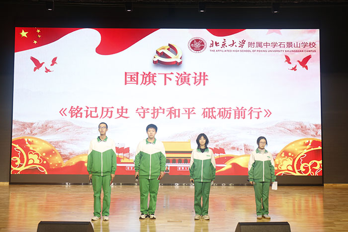 升旗仪式由高二1班陈梓玥、温子杨两位同学主持,邢睿同学担任升旗手。朱紫琨、王禹君、戴致君、申圳四位同学进行主题演讲《铭记历史 守护和平 砥砺前行》。