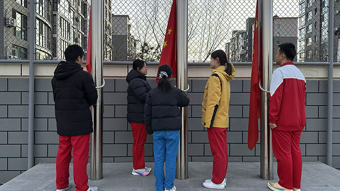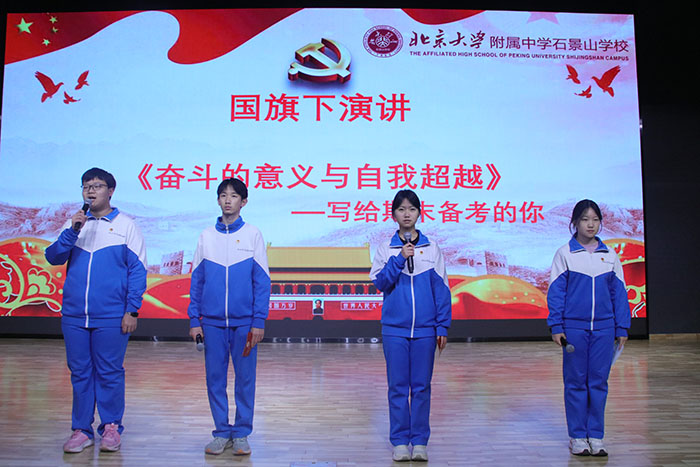 2026年1月5日,北大附中石景山学校举行第19周升旗仪式。本周升旗仪式由校团委负责。高一二班王茵童和李宇航主持。升旗手是来自高零2班的邓之涵同学。在庄严的升旗仪式后,团员代表翟嘉钰、齐子宁、苏雨萱、刘梓浩和王瑜老师带来了以“奋斗的意义与自我超越”为主题的国旗下演讲,旨在为正处于期末备考阶段的学子们注入精神动力,引导大家深刻思考奋斗的价值。