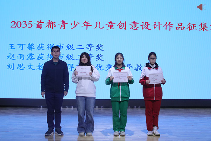 在“畅想2035首都青少年儿童创意设计作品征集活动”中,我校师生积极参与,凭借卓越的创意与扎实的实践,在市级评选中荣获佳绩。王可馨获得市级二等奖,赵雨露获得市级三等奖,刘思文老师获得市级优秀指导教师。