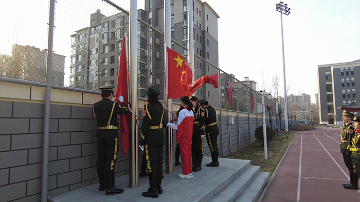 伴着出旗曲,五星红旗冉冉升起,全体师生肃立注目,少先队员行队礼,嘹亮的国歌响彻校园;随后校旗升起,校歌声声,尽显附中学子的昂扬风貌。