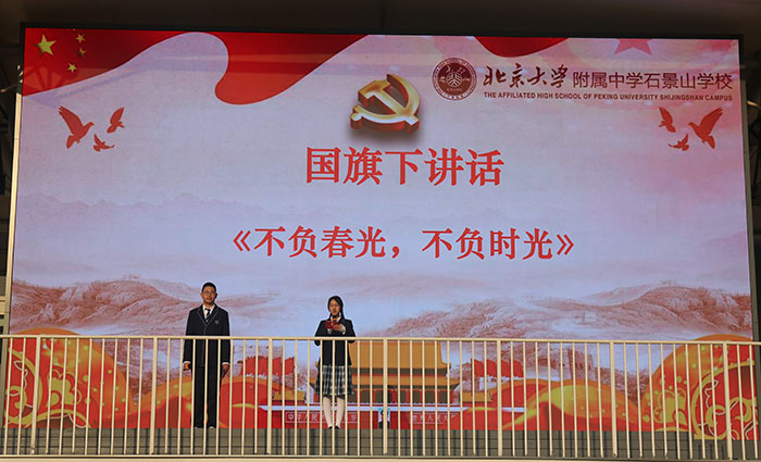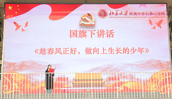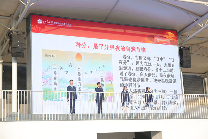2026年3月16日,北大附中石景山学校举行第三周升旗仪式。本次仪式以春分为主题,由初一2班王梓铭、石蕴瑶同学主持,苏姿帆同学担任升旗手,初一2班学子与班主任刘畅老师相继带来国旗下分享,在融融春光里为全校师生带来一堂融合节气文化与成长启迪的思政课。
