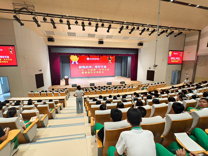 金秋九月,序章新启。为激励学子锚定成长航向、凝聚奋进力量,9月9日正午,初二年级全体师生齐聚报告厅,以"新程启序,笃行不怠"为主题召开新学期首次学生会。这场青春盛会既是对过往的礼赞,更是对未来的宣誓。