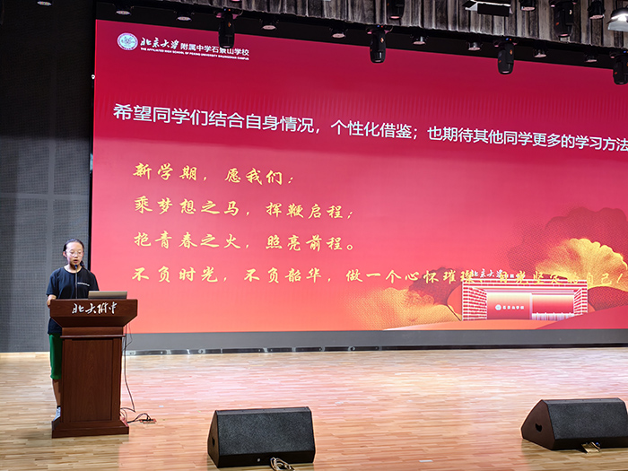 颁奖之后,8班的肖依萱同学作为优秀学生代表,分享她的暑假作业完成经验,如“番茄工作法”。她精彩的分享,赢得了全场热烈的掌声,也为同学们提供了可借鉴的学习方法。