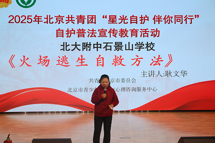 伴你同行”自护普法宣传教育活动在北大附中石景山学校小学部成功举办。本次活动特邀北京市青少年法律与心理咨询服务中心耿文华老师,为三年级的同学们带来了一场主题为《火场逃生自救方法》的精彩课程。