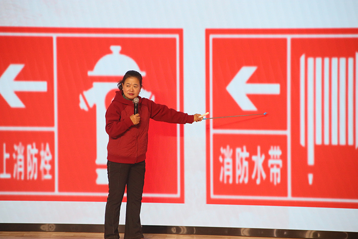 耿老师的课堂,更像是一场穿越火场的沉浸式探险。她用一个个生动的比喻和直观的演示,将“火灾”这个抽象而可怕的概念,拆解成了学生们能够理解、能够应对的具体场景。在传授救火常识的环节,耿老师化身为一线的指挥官。她手持灭火器,将“提、拔、握、压”的四字口诀,分解成一套充满力量感的动作仪式。在教授学生拧毛巾的技巧时,耿老师细致地演示:“要把毛巾对折,再对折,最后折成8层。8层的湿毛巾既能有效过滤部分有毒烟雾,又不会让呼吸太过困难。记住,对折三次就是8层,这是最容易记住的方法。”