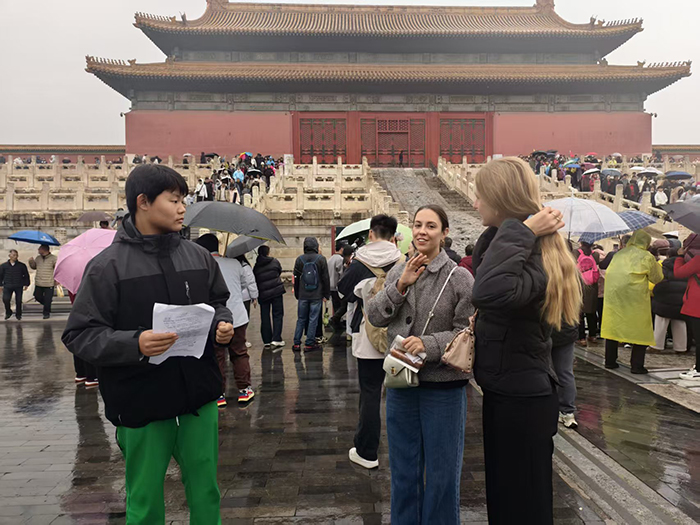 在太和殿外长廊避雨时,同学们偶遇几位外国游客,主动上前交流。一位澳大利亚游客称赞道:“雨中故宫更有东方韵味,而同学们的热情让这场雨变得难忘。”这场不经意的跨文化对话,成为研学生动的一课,也让同学们体验了作为文化使者的自豪。