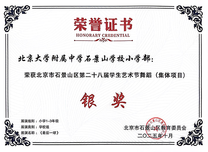 作品《最后一球》,以体育竞技为题材,以舞蹈语言刻画运动中的紧张、协作与永不放弃的拼搏精神,该作品在2025“舞动北京”青少年舞蹈展演获优秀表演奖,在北京市石景山区第28届学生艺术节舞蹈集体项目中获银奖。每一份荣誉的背后,都是无数汗水的凝结,是孩子们对舞蹈纯粹的热爱与执着。