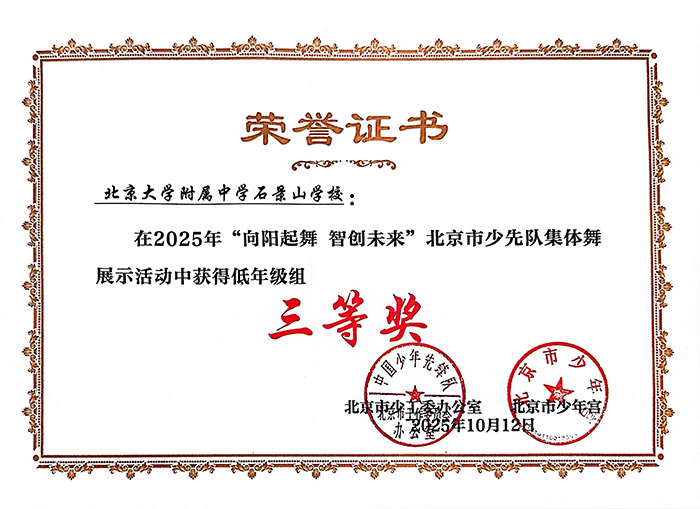 · 在2025年“向阳起舞智创未来”北京市少先队集体舞展示活动获低年级组三等奖。